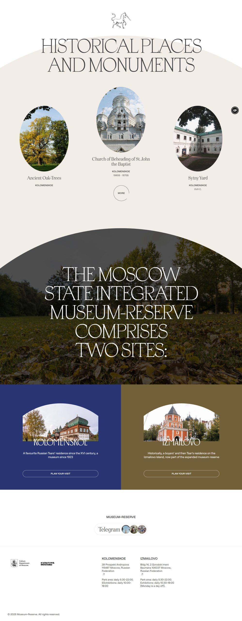 We collaborated on the design of the official website for the Moscow State Integrated Museum-Reserve, a prominent historical and architectural site. Our work focused on creating an engaging and informative digital portal for visitors. The platform provides comprehensive information on the museum’s two major estates, Kolomenskoye and Izmailovo, showcasing their rich history, exhibitions, and visitor services.